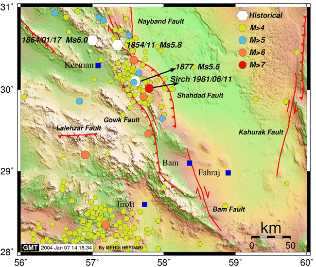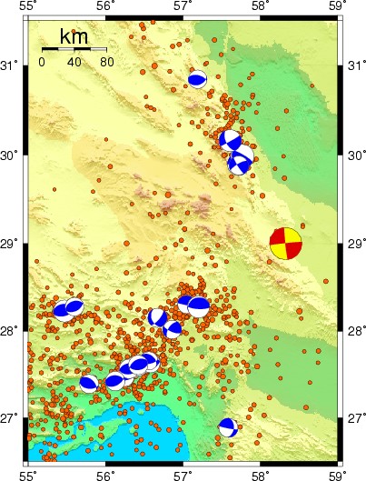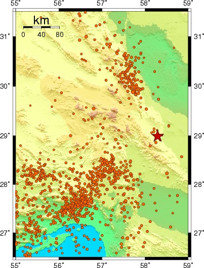 A strong earthquake of magnitude Mw=6.6 occurred at the South Iran near the city of Bam at 1:56:52 UTC on Friday, December 26, 2003. The epicenter was 975 km SE of Tehran, at a depth of about 10 km. More than 20.000 people were killed and the city of Bam have been destroyed. Electricity and telephones lines are down. |