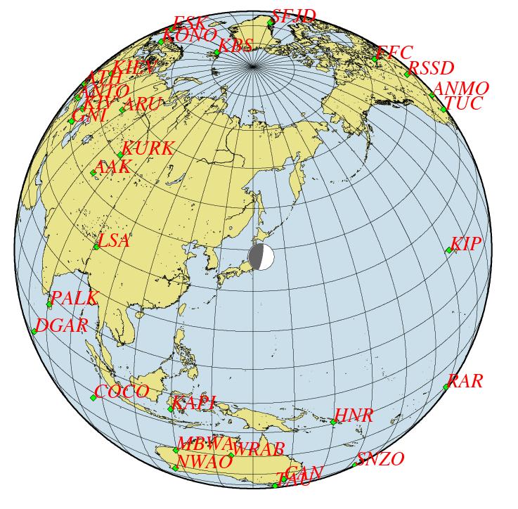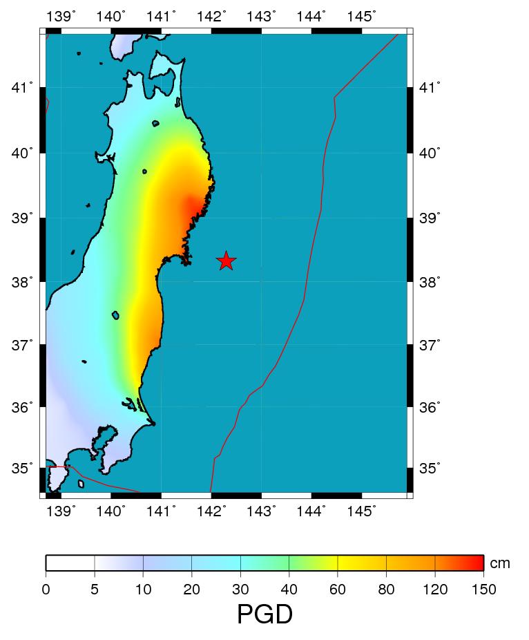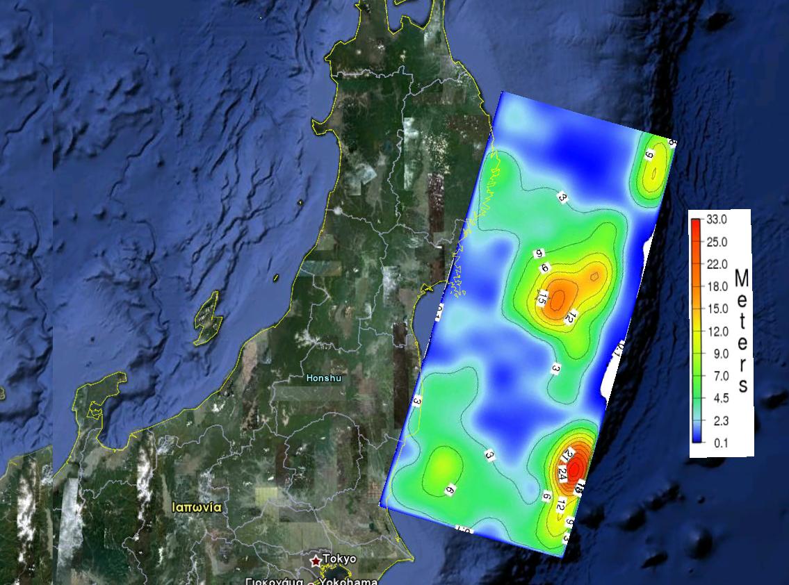 The magnitude 9.0 Tohoku earthquake on March 11, 2011, which occurred near the northeast coast of Honshu, Japan, resulted from thrust faulting on or near the subduction zone plate boundary between the Pacific and North America plates (USGS). The location, depth, and focal mechanism of the March 11 earthquake are consistent with the event having occurred on the subduction zone plate boundary. Modeling of the rupture of this earthquake indicate that the fault moved upwards of at least 20 m, and slipped over an area approximately 300 km long (along-strike) by 170 km wide (in the down-dip direction). The teleseismic inversion revealed a complicate rupture process with maximum slip close to 33 m. The map showing the projection of the slip and the synthetic peak ground displacement map show that parts of the coastal zone were up-lifted more than 1 m result which is also shown by other studies